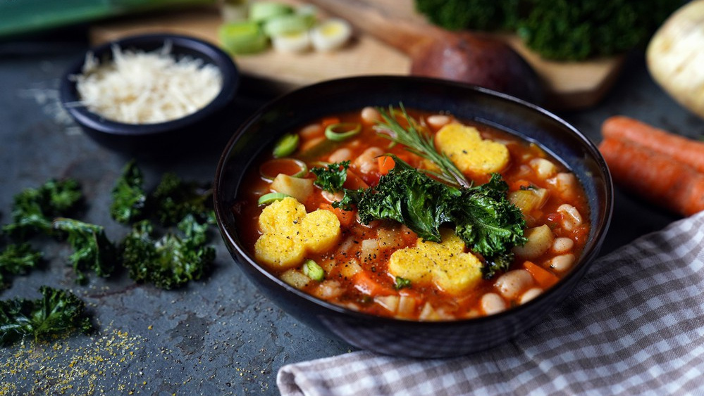 Minestrone mit Polenta, Grünkohl-Chips und geriebenem Parmesan servieren.