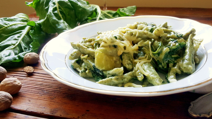 Pasta mit gedünsteter Namenia in cremiger Zitronensauce und einem Topping aus Walnüssen.