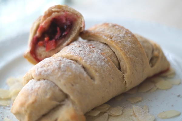 Backofen auf 180 Grad Umluft vorheizen. Blätterteig auf einem größeren Tisch ausrollen und in der Breite in 4 Stücke aufteilen.
