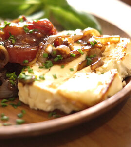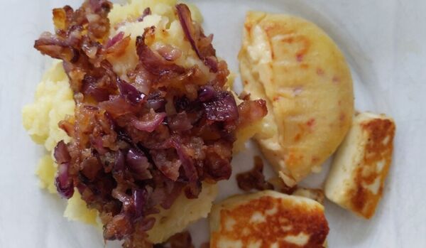 400g Pastinaken oder Petersilienwurzel, 1kg Kartoffeln, 1 Knoblauchzehe, Kochbrühe nach Bedarf, Butter, Muskatnuss, Salz & Pfeffer, 2 verschiedene Grillkäse, z.B. Monheimer Ziegenschnittkäse Chili und Griechischer Brat & Grillkäse, 6 rote Zwiebeln, etwas Dinkelmehl zum Panieren, etwas Oliven- und Rapsöl
